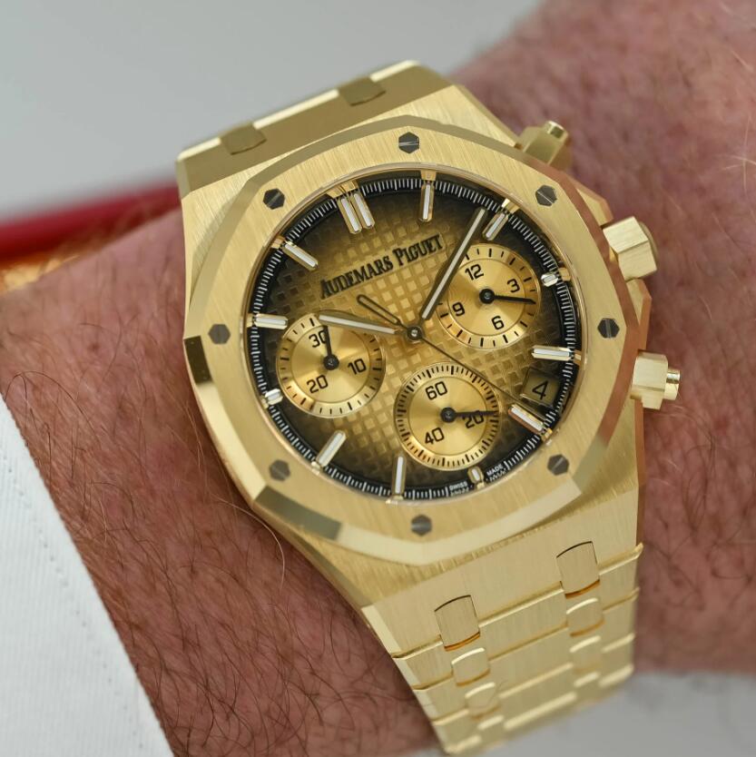 The dynamic fusion of a yellow gold 1:1 online replica watches with a gradient yellow gold-toned dial first made waves in 2022 with the unveiling of the Royal Oak Jumbo Extra-Thin 16202BA, a blend of boldness and elegance. However, when this distinctive aesthetic is applied to a chronograph, with its wider-bodied design with protruding pushers, it evokes an entirely different and more powerful feel, further accentuated by the dial’s grande tapisserie pattern – and not the petite tapisserie dial of the Jumbo 16202BA.